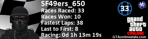 [URL=http://GTAonlinestats.com/showplayer/SF49ers_650][IMG]http://GTAonlinestats.com/racesignature/SF49ers_650/sig.png[/IMG][/URL]
