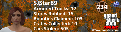 <a href="http://GTAonlinestats.com/showplayer/SJStar89"><img src="http://GTAonlinestats.com/signature/SJStar89/sig.png" alt="SJStar89" border="0" /></a>