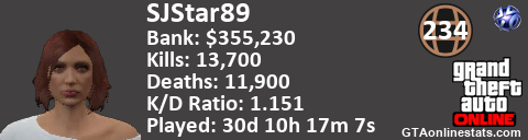 [URL=http://GTAonlinestats.com/showplayer/SJStar89][IMG]http://GTAonlinestats.com/signature/SJStar89/sig.png[/IMG][/URL]