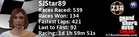 [URL=http://GTAonlinestats.com/showplayer/SJStar89][IMG]http://GTAonlinestats.com/racesignature/SJStar89/sig.png[/IMG][/URL]