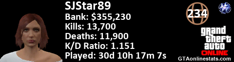 <a href="http://GTAonlinestats.com/showplayer/SJStar89"><img src="http://GTAonlinestats.com/dmsignature/SJStar89/sig.png" alt="SJStar89" border="0" /></a>