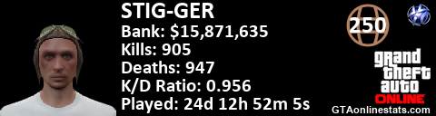 <a href="http://GTAonlinestats.com/showplayer/STIG-GER"><img src="http://GTAonlinestats.com/greysignature/STIG-GER/sig.png" alt="STIG-GER" border="0" /></a>