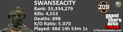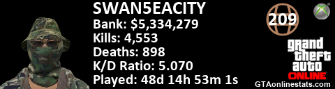 [URL=http://GTAonlinestats.com/showplayer/SWAN5EACITY][IMG]http://GTAonlinestats.com/signature/SWAN5EACITY/sig.png[/IMG][/URL]