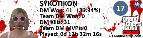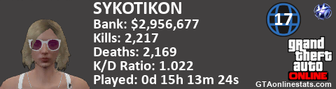 [URL=http://GTAonlinestats.com/showplayer/SYKOTIKON/2][IMG]http://GTAonlinestats.com/signature/SYKOTIKON/2/sig.png[/IMG][/URL]