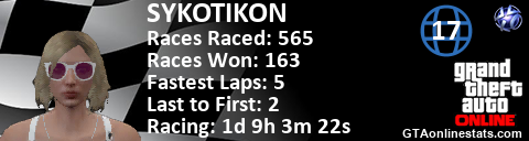 <a href="http://GTAonlinestats.com/showplayer/SYKOTIKON/2"><img src="http://GTAonlinestats.com/racesignature/SYKOTIKON/2/sig.png" alt="SYKOTIKON" border="0" /></a>