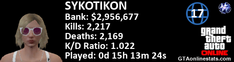 <a href="http://GTAonlinestats.com/showplayer/SYKOTIKON/2"><img src="http://GTAonlinestats.com/signature/SYKOTIKON/2/sig.png" alt="SYKOTIKON" border="0" /></a>