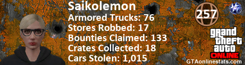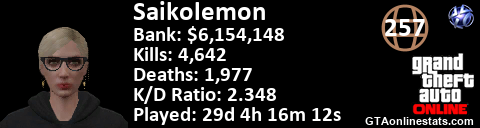 <a href="http://GTAonlinestats.com/showplayer/Saikolemon"><img src="http://GTAonlinestats.com/randomsignature/Saikolemon/sig.png" alt="Saikolemon" border="0" /></a>