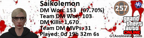 [URL=http://GTAonlinestats.com/showplayer/Saikolemon][IMG]http://GTAonlinestats.com/dmsignature/Saikolemon/sig.png[/IMG][/URL]