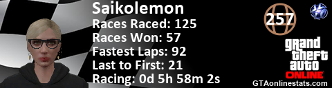 <a href="http://GTAonlinestats.com/showplayer/Saikolemon"><img src="http://GTAonlinestats.com/racesignature/Saikolemon/sig.png" alt="Saikolemon" border="0" /></a>