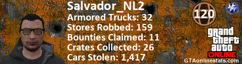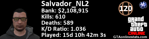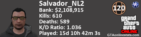 <a href="http://GTAonlinestats.com/showplayer/Salvador_NL2/2"><img src="http://GTAonlinestats.com/dmsignature/Salvador_NL2/2/sig.png" alt="Salvador_NL2" border="0" /></a>