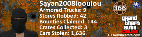 <a href="http://GTAonlinestats.com/showplayer/Sayan2008looulou"><img src="http://GTAonlinestats.com/crimesignature/Sayan2008looulou/sig.png" alt="Sayan2008looulou" border="0" /></a>
