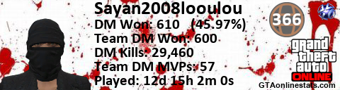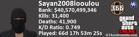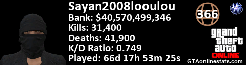 <a href="http://GTAonlinestats.com/showplayer/Sayan2008looulou"><img src="http://GTAonlinestats.com/randomsignature/Sayan2008looulou/sig.png" alt="Sayan2008looulou" border="0" /></a>