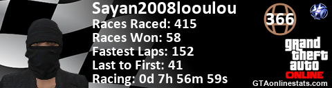 [URL=http://GTAonlinestats.com/showplayer/Sayan2008looulou][IMG]http://GTAonlinestats.com/racesignature/Sayan2008looulou/sig.png[/IMG][/URL]
