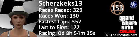 <a href="http://GTAonlinestats.com/showplayer/Scherzkeks13"><img src="http://GTAonlinestats.com/racesignature/Scherzkeks13/sig.png" alt="Scherzkeks13" border="0" /></a>