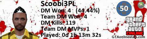 [URL=http://GTAonlinestats.com/showplayer/Scoobi3PL][IMG]http://GTAonlinestats.com/dmsignature/Scoobi3PL/sig.png[/IMG][/URL]