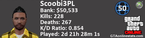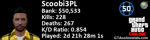 <a href="http://GTAonlinestats.com/showplayer/Scoobi3PL"><img src="http://GTAonlinestats.com/dmsignature/Scoobi3PL/sig.png" alt="Scoobi3PL" border="0" /></a>