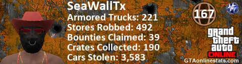 [URL=http://GTAonlinestats.com/showplayer/SeaWallTx][IMG]http://GTAonlinestats.com/crimesignature/SeaWallTx/sig.png[/IMG][/URL]