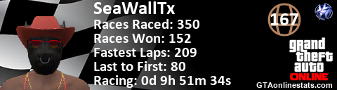 [URL=http://GTAonlinestats.com/showplayer/SeaWallTx][IMG]http://GTAonlinestats.com/racesignature/SeaWallTx/sig.png[/IMG][/URL]