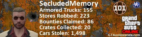 [URL=http://GTAonlinestats.com/showplayer/SecludedMemory][IMG]http://GTAonlinestats.com/crimesignature/SecludedMemory/sig.png[/IMG][/URL]