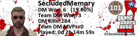 [URL=http://GTAonlinestats.com/showplayer/SecludedMemory][IMG]http://GTAonlinestats.com/dmsignature/SecludedMemory/sig.png[/IMG][/URL]