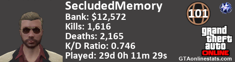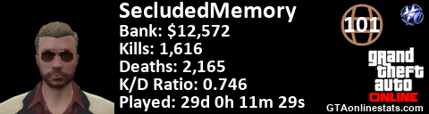 [URL=http://GTAonlinestats.com/showplayer/SecludedMemory][IMG]http://GTAonlinestats.com/signature/SecludedMemory/sig.png[/IMG][/URL]