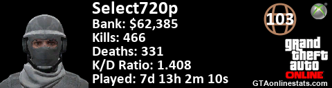 [URL=http://GTAonlinestats.com/showplayer/Select720p][IMG]http://GTAonlinestats.com/signature/Select720p/sig.png[/IMG][/URL]