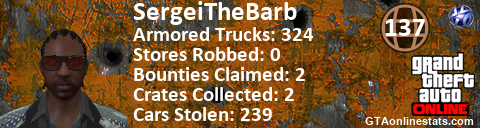 [URL=http://GTAonlinestats.com/showplayer/SergeiTheBarb/2][IMG]http://GTAonlinestats.com/crimesignature/SergeiTheBarb/2/sig.png[/IMG][/URL]