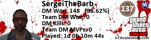 [URL=http://GTAonlinestats.com/showplayer/SergeiTheBarb/2][IMG]http://GTAonlinestats.com/dmsignature/SergeiTheBarb/2/sig.png[/IMG][/URL]