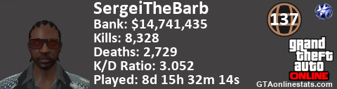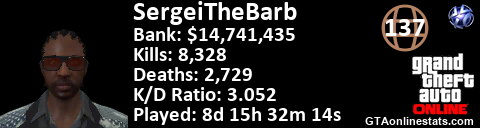 [URL=http://GTAonlinestats.com/showplayer/SergeiTheBarb/2][IMG]http://GTAonlinestats.com/signature/SergeiTheBarb/2/sig.png[/IMG][/URL]