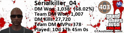 [URL=http://GTAonlinestats.com/showplayer/Serialkiller_04][IMG]http://GTAonlinestats.com/dmsignature/Serialkiller_04/sig.png[/IMG][/URL]