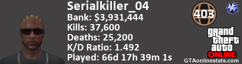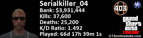 [URL=http://GTAonlinestats.com/showplayer/Serialkiller_04][IMG]http://GTAonlinestats.com/signature/Serialkiller_04/sig.png[/IMG][/URL]