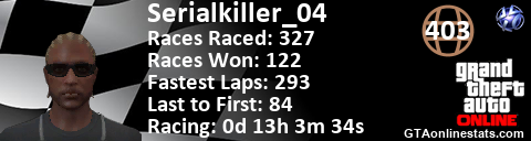 <a href="http://GTAonlinestats.com/showplayer/Serialkiller_04"><img src="http://GTAonlinestats.com/racesignature/Serialkiller_04/sig.png" alt="Serialkiller_04" border="0" /></a>
