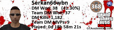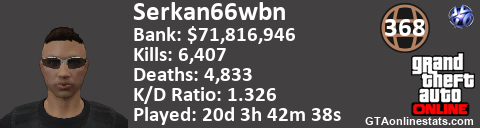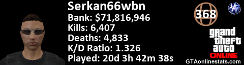 [URL=http://GTAonlinestats.com/showplayer/Serkan66wbn][IMG]http://GTAonlinestats.com/dmsignature/Serkan66wbn/sig.png[/IMG][/URL]