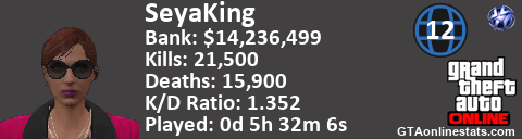 [URL=http://GTAonlinestats.com/showplayer/SeyaKing/2][IMG]http://GTAonlinestats.com/signature/SeyaKing/2/sig.png[/IMG][/URL]