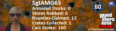 [URL=http://GTAonlinestats.com/showplayer/SgtAMG65/2][IMG]http://GTAonlinestats.com/crimesignature/SgtAMG65/2/sig.png[/IMG][/URL]