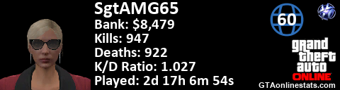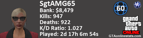 [URL=http://GTAonlinestats.com/showplayer/SgtAMG65/2][IMG]http://GTAonlinestats.com/dmsignature/SgtAMG65/2/sig.png[/IMG][/URL]
