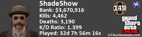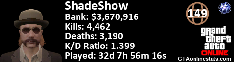 <a href="http://GTAonlinestats.com/showplayer/ShadeShow"><img src="http://GTAonlinestats.com/signature/ShadeShow/sig.png" alt="ShadeShow" border="0" /></a>