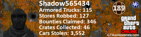 [URL=http://GTAonlinestats.com/showplayer/Shadow565434][IMG]http://GTAonlinestats.com/signature/Shadow565434/sig.png[/IMG][/URL]