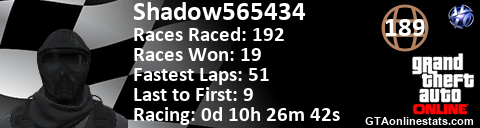 <a href="http://GTAonlinestats.com/showplayer/Shadow565434"><img src="http://GTAonlinestats.com/racesignature/Shadow565434/sig.png" alt="Shadow565434" border="0" /></a>