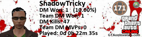 [URL=http://GTAonlinestats.com/showplayer/ShadowTricky][IMG]http://GTAonlinestats.com/dmsignature/ShadowTricky/sig.png[/IMG][/URL]