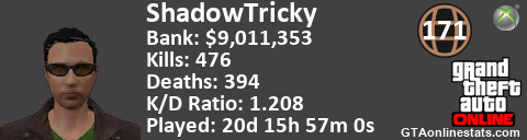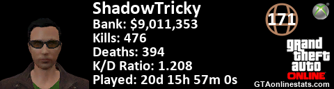 <a href="http://GTAonlinestats.com/showplayer/ShadowTricky"><img src="http://GTAonlinestats.com/signature/ShadowTricky/sig.png" alt="ShadowTricky" border="0" /></a>
