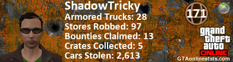 [URL=http://GTAonlinestats.com/showplayer/ShadowTricky][IMG]http://GTAonlinestats.com/crimesignature/ShadowTricky/sig.png[/IMG][/URL]