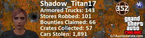 [URL=http://GTAonlinestats.com/showplayer/Shadow_Titan17][IMG]http://GTAonlinestats.com/crimesignature/Shadow_Titan17/sig.png[/IMG][/URL]