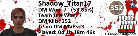 [URL=http://GTAonlinestats.com/showplayer/Shadow_Titan17][IMG]http://GTAonlinestats.com/dmsignature/Shadow_Titan17/sig.png[/IMG][/URL]