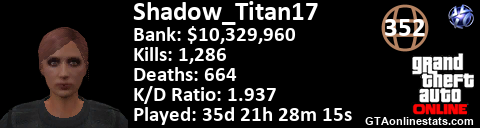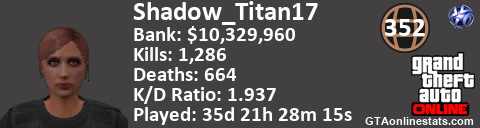 [URL=http://GTAonlinestats.com/showplayer/Shadow_Titan17][IMG]http://GTAonlinestats.com/signature/Shadow_Titan17/sig.png[/IMG][/URL]