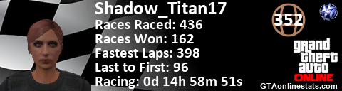 <a href="http://GTAonlinestats.com/showplayer/Shadow_Titan17"><img src="http://GTAonlinestats.com/racesignature/Shadow_Titan17/sig.png" alt="Shadow_Titan17" border="0" /></a>