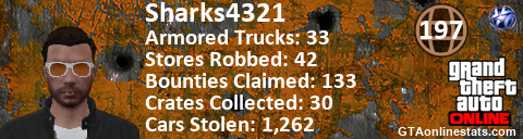 [URL=http://GTAonlinestats.com/showplayer/Sharks4321][IMG]http://GTAonlinestats.com/signature/Sharks4321/sig.png[/IMG][/URL]