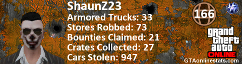 [URL=http://GTAonlinestats.com/showplayer/ShaunZ23][IMG]http://GTAonlinestats.com/crimesignature/ShaunZ23/sig.png[/IMG][/URL]