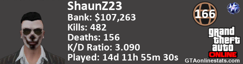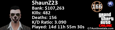 <a href="http://GTAonlinestats.com/showplayer/ShaunZ23"><img src="http://GTAonlinestats.com/signature/ShaunZ23/sig.png" alt="ShaunZ23" border="0" /></a>