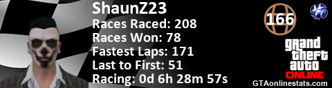 [URL=http://GTAonlinestats.com/showplayer/ShaunZ23][IMG]http://GTAonlinestats.com/racesignature/ShaunZ23/sig.png[/IMG][/URL]